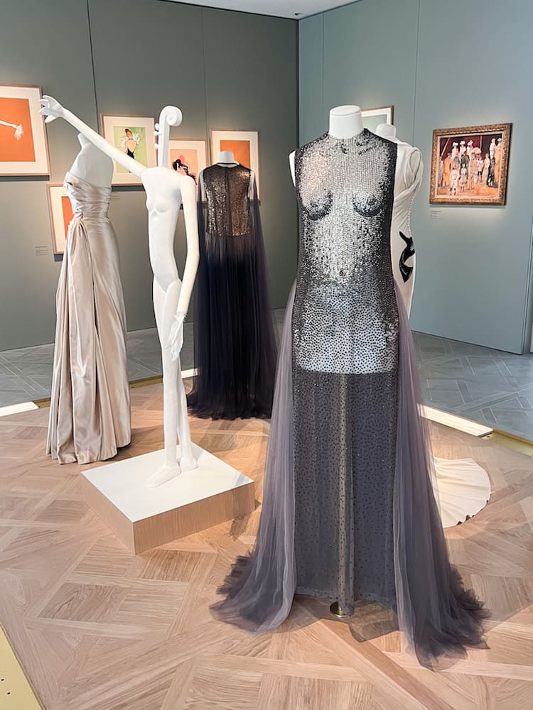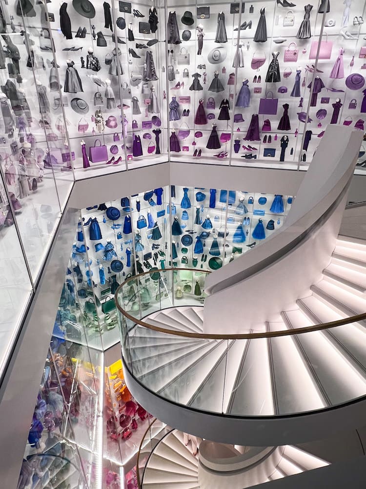 The entrance to the museum is on the side of the building at number 11 rue François 1er. You take the huge spiral staircase up, where the walls are decorated with miniatures of more than 1,000 creations in different colors representing the Dior style from 1947 to the present, the “Diorama.”